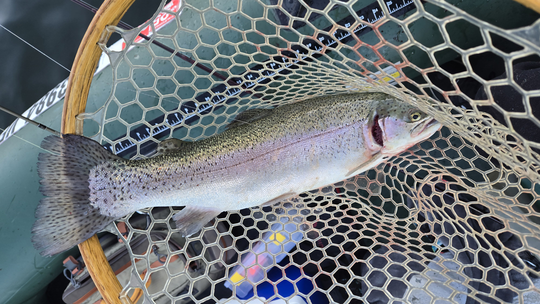 The lake went glassy in the afternoon and we struggled to get anymore grabs. Everyone that we had passed by were also having a tough time hooking fish. I switched to a trout trix bubblegum worm about halfway through the day and at about 4pm, right when the wind started picking up, we hooked another fish. This fish was another big stockie and we cheered as soon as we got it into the net.