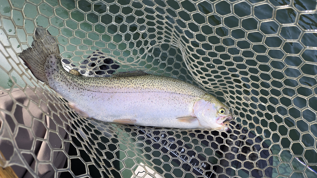 Collins Lake is a pay to play lake that offers year-round camping, fishing, and rentals. Stocking the lake as heavily as they do comes at a cost at $20 for a day pass and $30 with a boat on weekends therefore it’s important to be as effective on the water as you can out there. My son and I got a bit of a late start our first outing in early December and we put our Seaeagle Stealth Stalker in the water at around 11am. We started the day trolling a pink bugger type fly that I tied on an action disc at around 5ft. We covered water going up the arm of the west side and hooked our first fish about an hour in. I could tell that we had a something on the end of the line but the clip didn’t come loose making me believed we had snagged on something as we had just passed by a submerged rope. I grabbed the rod and started reeling in the line convinced that it was a snag until it started moving. When I finally got a good amount of line in and I saw that we had hooked a huge trout. Somehow the rod line got wrapped around the trolling line and I had to hand line the rest of the line in while my son tried to net it. My son was having some trouble reaching the fish and by the time I had the chance to take over the netting the fish came loose. Although we lost the fish it was an exciting start to the day; knowing that we were doing something right restored my confidence to keep going and try to hook another one.
